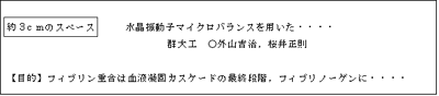 和文講演要旨は平成21年4月10日(金)(必着)までに以下の要領で電子ファイルを年会事務局まで提出ください(メール添付でもCDやフロッピーディスクをお送り下さっても結構です)。 |